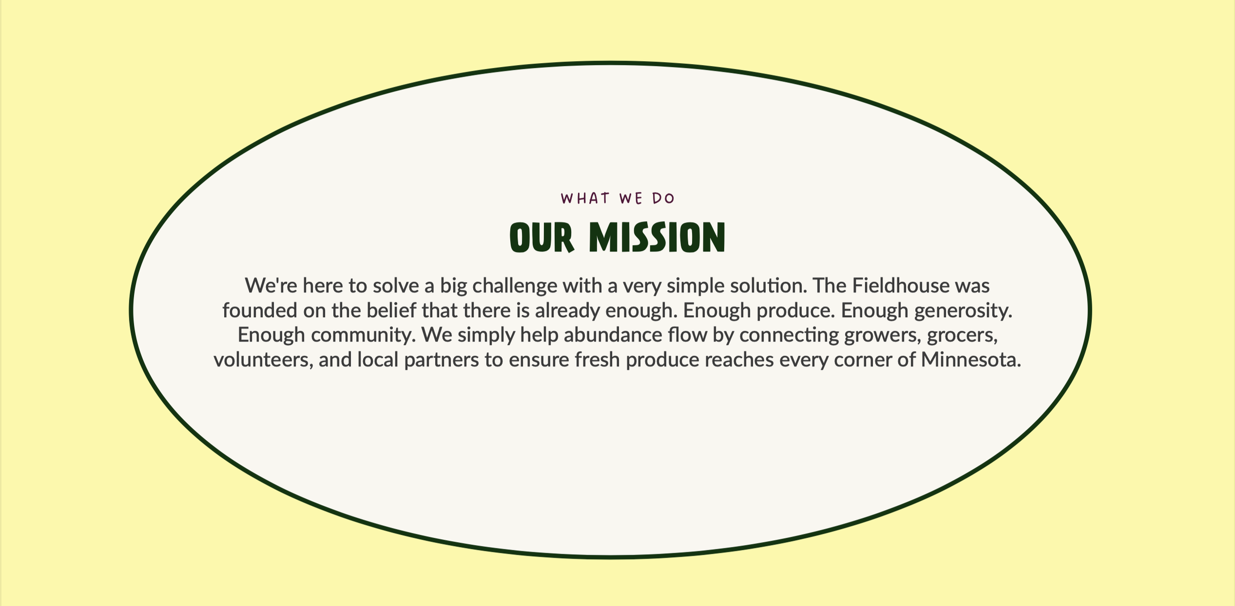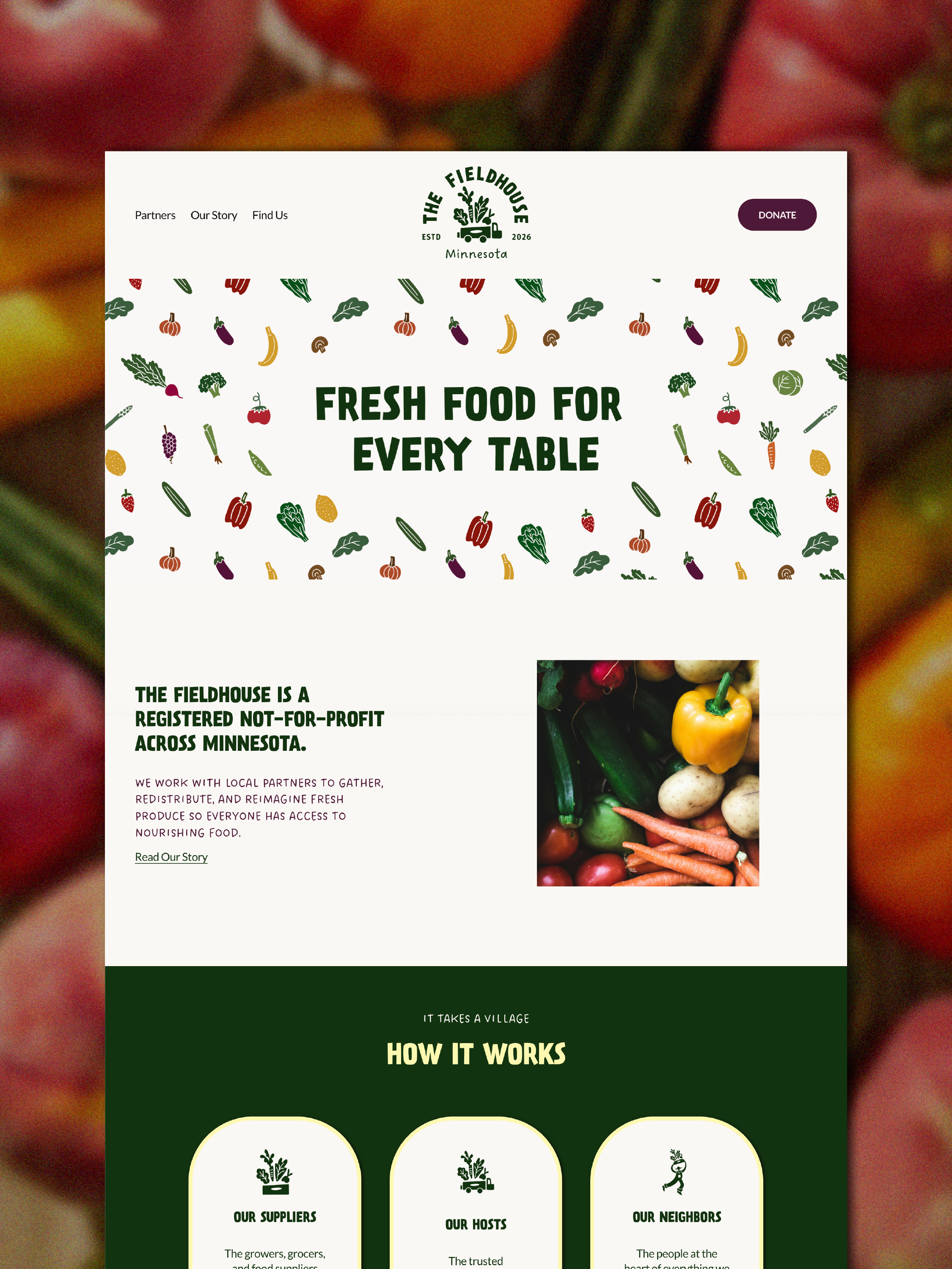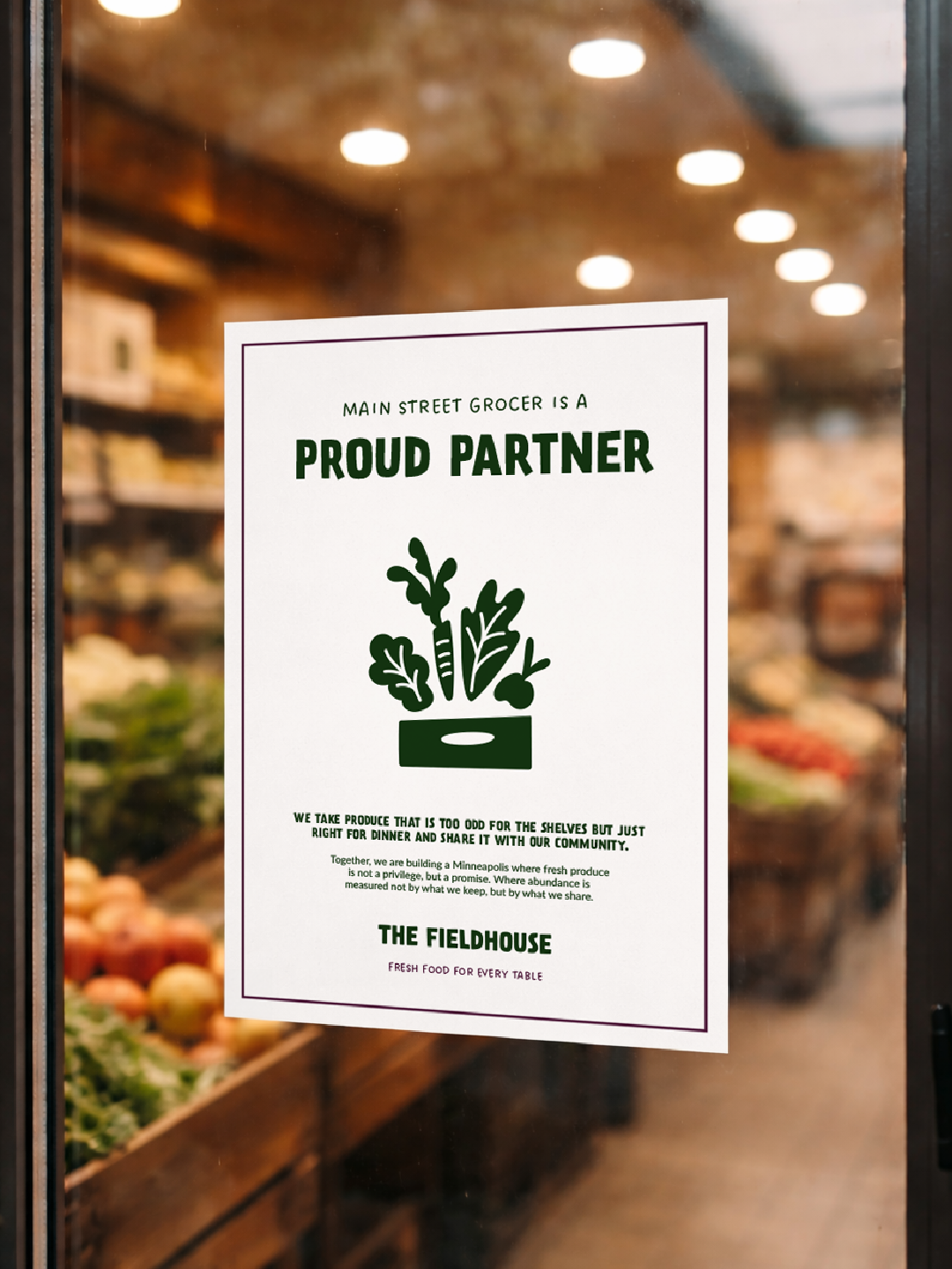 The ultimate objective was to translate The Fieldhouse’s story into a visual identity and brand personality that felt light, approachable, and intentionally non-corporate. As a grassroots organization, our priority was to create a brand that was inclusive and grounded in the belief that providing access to fresh food while reducing unnecessary waste is a simple and obvious path to a healthier, happier community.